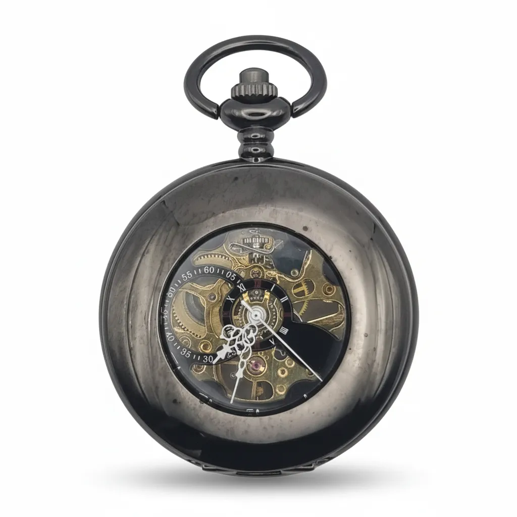 With a black metal frame, this pocket watch has a half hunter design that resembles a black doughnut. The large viewing window reveals a see-through watch with gold, black and silver-coloured inner workings.
