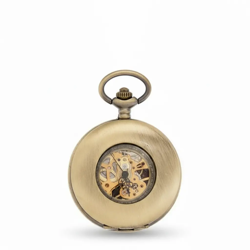 Featuring a brass-colored frame and half hunter cover, this pocket watch resembles a brass doughnut with a centre viewing window that reveals the inner workings, including our gold plated gear which can clearly be viewed from the rear of the piece.