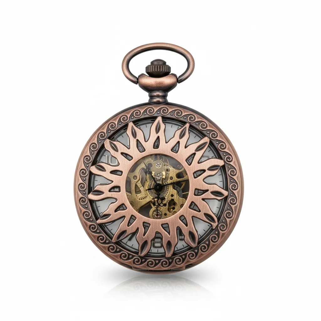 This pocket watch features a brass-colored frame and half hunter cover with a sunburst design with rays hitting a ring of waves. The viewing windows reveal a white outer watch face and see-through centre with gold-coloured inner workings.