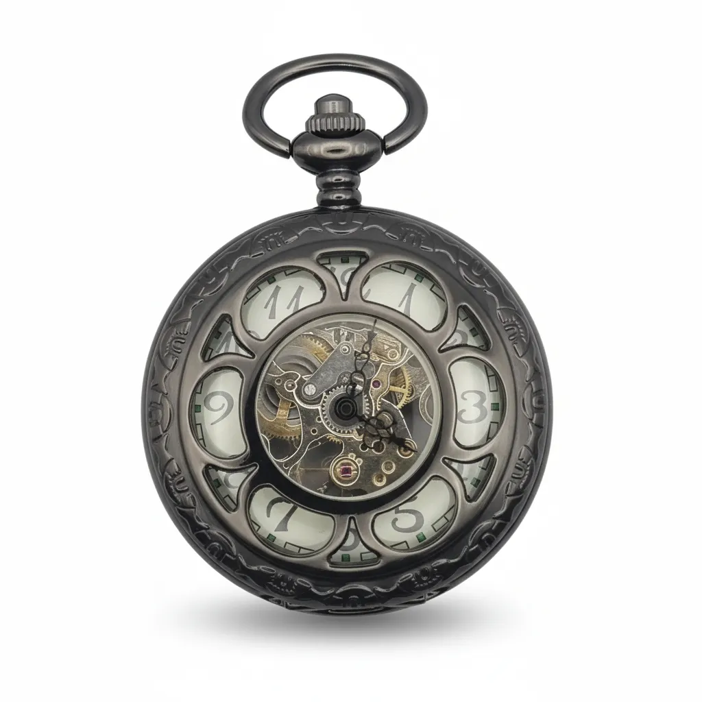 This pocket watch has a dark metal frame and a half hunter cover with the shape of a large daisy on it. The many viewing windows reveal a watch with a white outer ring and stylish numbers and a see-through design in the centre showing gold-coloured inner workings.