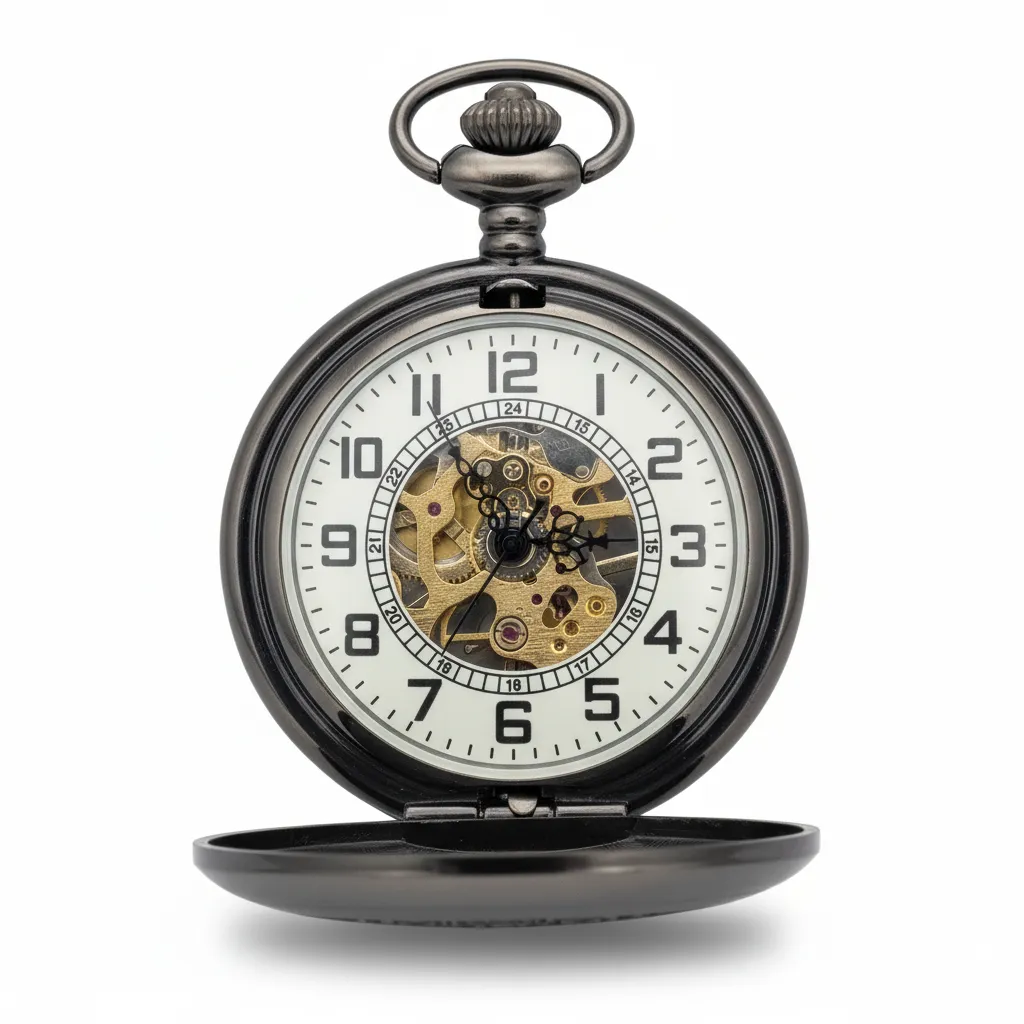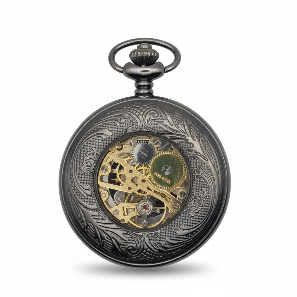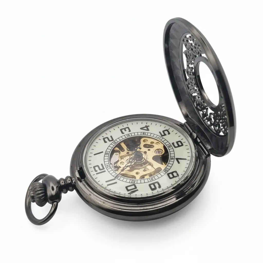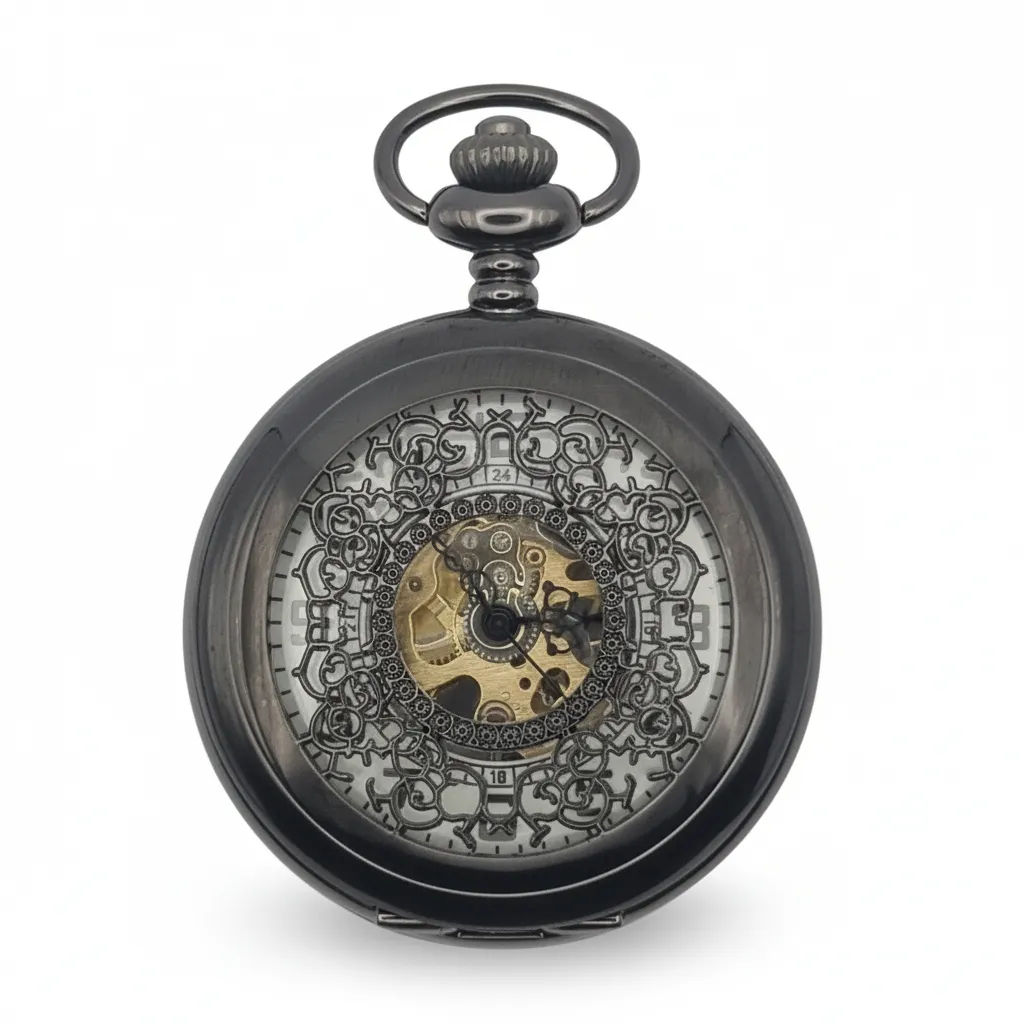 With a dark metal frame, this pocket watch features a half hunter cover with an intricate ringlet design with several viewing windows revealing a glow-in-the-dark watch face and a see-through centre showing gold-coloured inner workings. You can also view our exclusive gold plated gear through the rear window.